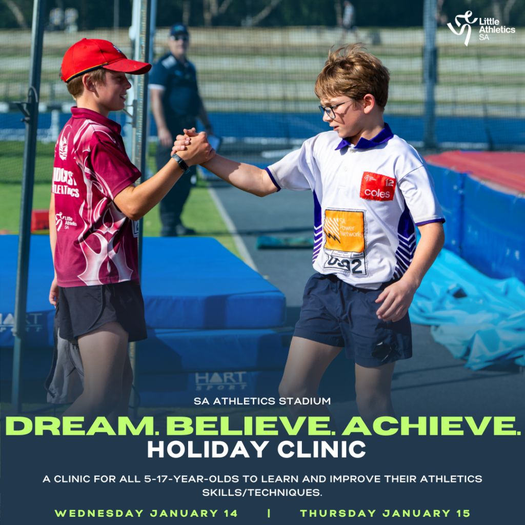 OPEN to ALL 5-17 year-olds, this clinic provides a great opportunity for you to learn, have fun, and improve your athletics skills, as well as the unique opportunity to receive coaching and guidance from some of South Australia’s BEST Coaches.