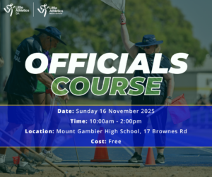 - Your role as an official, the Education Pathway, managing and communicating with athletes and the different aspects of each Little Athletics event.